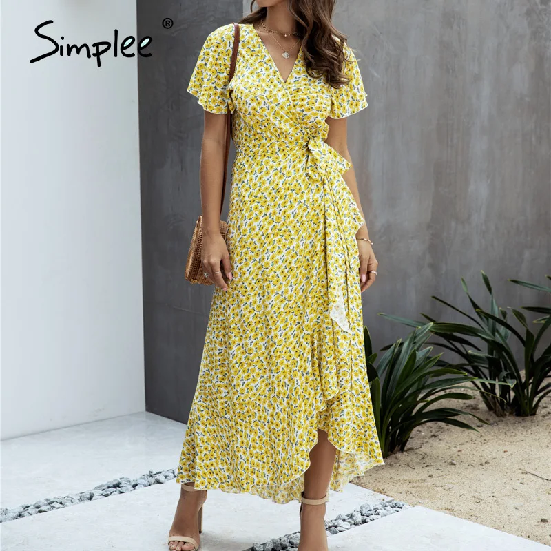 HIGH QUALITY Simplee Sexy floral print women dress Plus size v neck ruffled wrapping beach dress High waist belt