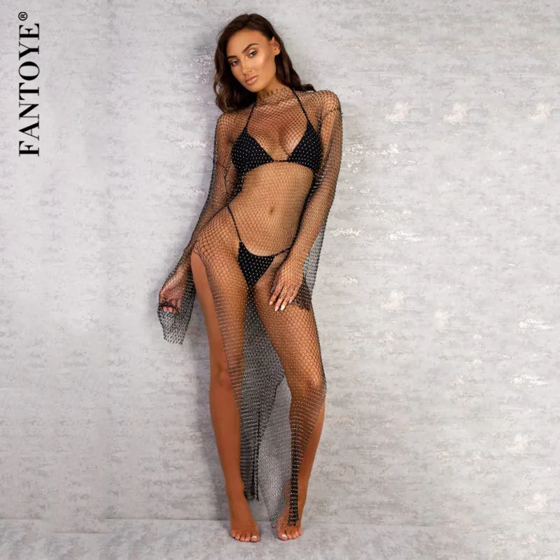 HOT SALE FANTOYE New Diamond Shiny Party Dress Women Split Long Sleeve Maxi Bodycon Dress Sexy See-Through F