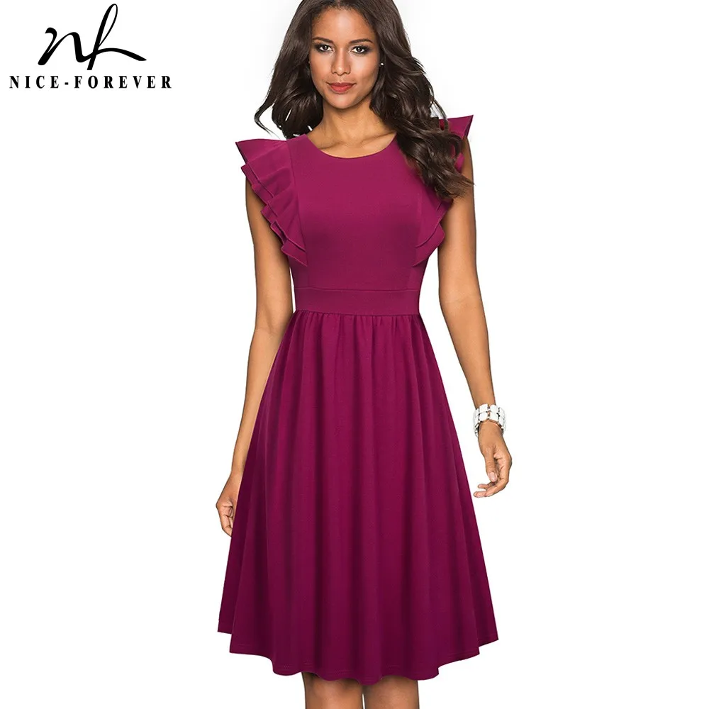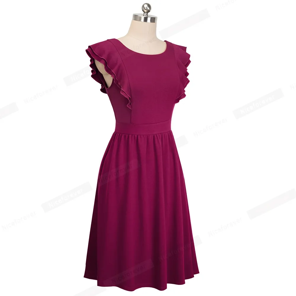 Hot Sale Nice-forever Elegant Retro Pure color Ruffle Sleeve vestidos Business Party Female Women Swing Flar