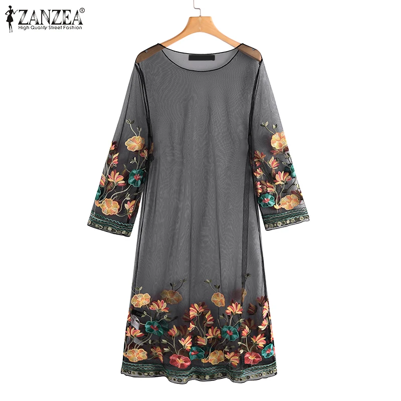 TOP ZANZEA Women Dress Sexy Mesh 2020 Vintage Embroidery Flowers Short Vestidos Summer Beach Party Outw