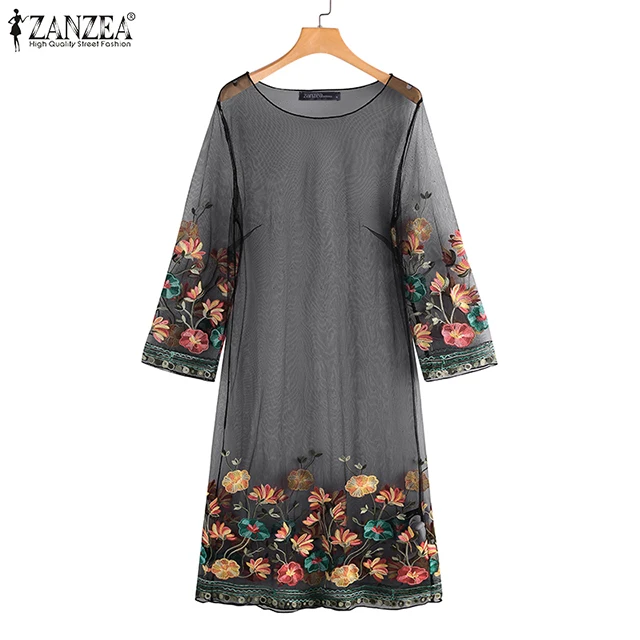 Review Top ZANZEA Women Dress Sexy Mesh 2020 Vintage Embroidery Flowers Short Vestidos Summer Beach Party Outw